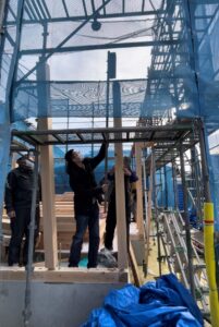 棟梁と柱打ちの共同作業を行い、上棟を開始しました。