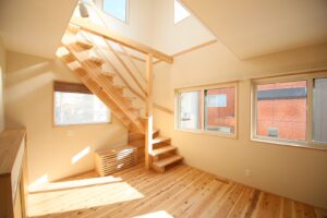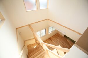 また南側は道路があり日当たりが期待できるスペースがあるため、吹き抜けを取りながら明るさと冬の日差しを活用したリビング空間にしました✨