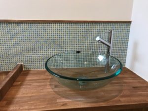 手洗い器もモザイクタイルを背面にガラスタイルを使ったオリジナル感満載です