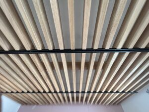 こちら、天井につけた木格子に照明のダクトレールを埋め込んでいます。