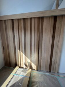 こんにちは。 柿田大輔です。 東広島寺家で建築中のBIOBASEですが工事もいよいよ大詰め! 色々な種類の建具を造作したのですが そのうちの一つがこちら!レッドシダーで作った3枚引き戸でございます! 今までレッドシダーは外壁や