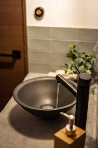 こちらはコンクリート調のカウンターにブラックのボウルとブラック水栓を合わせ クールに仕上げました。 奥に見える照明のスイッチも一般的なスイッチにせず「アクシス」の登記スイッチをつけました。