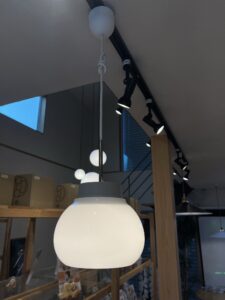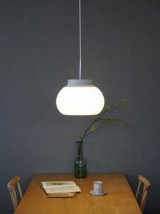 丸くかわいい見た目に、乳白ガラスでできたシェード部分は光を和らげて周りを照らしてくれます。 光源が見えないので、眩しくないのも特徴です。 BIOBASEにも少し小さいサイズをおいています。 こちらはキッチン上に2から3灯つけてあげるとおしゃれであたたかい空間を作ることができます。