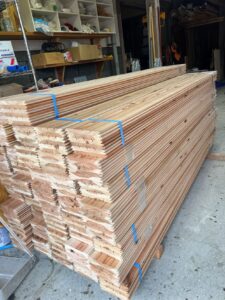 こんにちは。 柿田大輔です。 先日お客様と床塗りをやってきました。塗るのはこちら無垢の国産杉床材! 最初は束になっています。 断面をよく見てみると分かるのですが、床材の表面と表面がくっついた状態で搬入されてきます。 表面同士をくっつけると必然的に、裏面が表面に出てきますので大事な表面が傷つきにくいんです! こちらの大事に持ってきた床材一枚一枚を塗装していきます。 塗装に使うのは、自然塗料の「リボス」 カラーは木部をナチュラルな色に仕上げることのできる「白木」を選定。 床材の塗装は「ウレタン塗装」と「オイル塗装」の2種類に分けることができるのですが リボスはオイル塗装という種類に分類されます。 オイル塗装は木の組織に塗料を浸透させていく塗装方法で、塗装をしても木の呼吸を妨げません。 そのため、木の本来の見た目や手触り感、温かみを損なわない塗装にすることが可能になります。 更にリボスは自然由来の成分で作られた塗料のため、科学物質の排出が非常に少ないことが特徴です。 大喜のお家に入ったときに、化学物質特有の香りがしないのは使っている塗料が自然由来であることも1つの理由です!