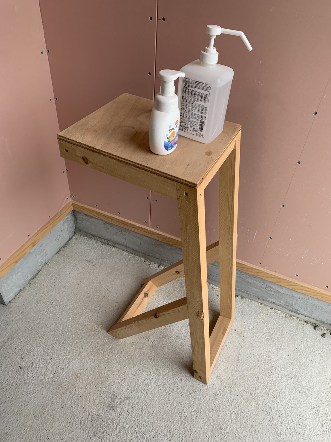 本日安全パトロールで現場に行くと、大工さんがお手製の消毒液台を作っていました。