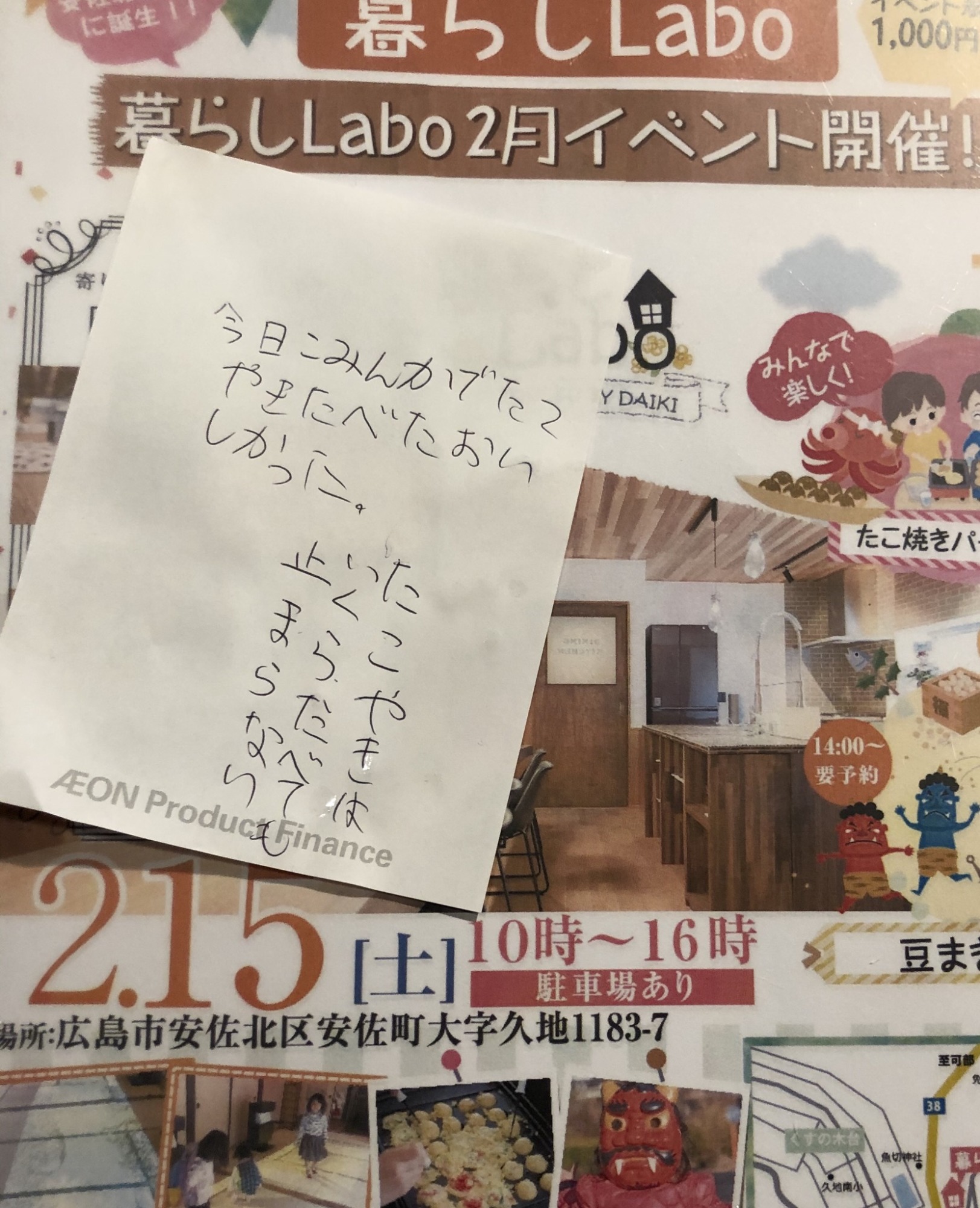 ホーム > 大喜ブログ >【暮らしLabo 2月イベントは】広島工務店ブログvol.555 ブログ BLOG 【暮らしLabo 2月イベントは】広島工務店ブログvol.555 【 柿田浩子 】 投稿日:2020.02.16 一覧に戻る 昨日の暮らしLaboのイベントは たこ焼きパーティー 豆まき でした。 皆さん手際良くて^_^とても上手でした。 子供たちも上手にコロコロ。 美味しくいただきました。 そして、節分豆まき。 A様パパも鬼になって頂き、盛り上がりました。 子供たちからはアンコール!アンコール! 豆まきもとてもたのしかったです。 A様、ご協力いただきありがとうございました😊 そして、キッチンには こんな可愛い💕メモが置いてありました。 これはY様の娘さん、Yちゃんから。 ありがとう😊Yちゃん❣️ とても嬉しいです😊 柿田浩子 user-daiki カレンダー <<前の月 2026年1月2025年12月2025年11月2025年10月2025年9月2025年8月 次の月>> 日月火水木金土12345678910111213141516171819202122232425262728293031日月火水木金土12345678910111213141516171819202122232425262728293031日月火水木金土123456789101112131415161718192021222324252627282930日月火水木金土12345678910111213141516171819202122232425262728293031日月火水木金土123456789101112131415161718192021222324252627282930日月火水木金土12345678910111213141516171819202122232425262728293031 最近のエントリ 最近のエントリ 01/24 【金毘羅山参り】広島工務店ブログvol.1687 01/22 【構造用合板のコト】広島工務店ブログvol.1686 01/19 【あんぱん】広島工務店ブログvol.1685 01/18 【木造住宅 耐震調査】広島工務店ブログvol.1684 01/17 【YouTube更新】エアコン1台で家中快適!職人技が光る造作キッチンと、こだわり抜いた「釣り動線」を巡るルームツアー カテゴリー ブログ(1,905) ・岡本拓也(15) ・越智彩愛(11) ・竹吉朗(7) ・竹本明子(149) ・山﨑昂篤(5) ・柿田浩子(225) ・柿田大輔(346) ・柿田勝司(309) ・細澤良(61) ・平田政貴(71) ・吉岡靖(76) ・藤田豊(70) ・野村崇(44) ・溝上暁大(69) ・大畑美和(45) ・熊本由美子(56) ・大喜ブログ(1327) ・スタッフブログ(639) ・お知らせ(44) ・未分類(114) ブログアーカイブ ・2026年1月 (12) ・2025年12月 (11) ・2025年11月 (11) ・2025年10月 (10) ・2025年9月 (7) ・2025年8月 (14)