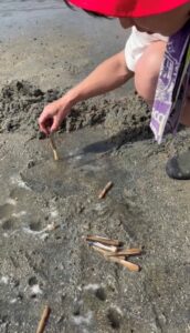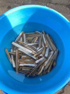 先日マテ貝を掘りに行ってきました! 準備するものはクワ、塩、バケツです! まずクワで10センチくらい土を掘ります。 そうするとポツポツ穴が出てくるのでそこに塩をかけてしばらく待ちます。 そうするとマテ貝がにょきっと顔を出すので掴んで引き抜きます! このとき力を入れすぎるとちぎれてしまうので絶妙な力加減で! 1時間半くらいでバケツいっぱいになるくらい取れました! 調理方法は普通の貝と同じように、酒蒸しでもバターでもいいとのこと! 新しい経験ができて有意義な休日でした!![]()