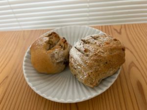 経理担当浩子さんが焼いてくれた2種類のパンです オレンジピールのライ麦パン(紅茶入り) 栗の渋皮煮・クリームチーズ・クルミ入り プロ級の味で美味しかった~ いつもありがとう(^-^)![]()
