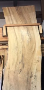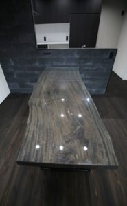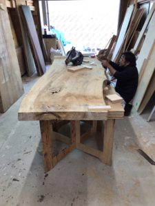 LDKに置かれる家具はTVボード・ソファ・ダイニングテーブル。 この三つがメインの家具ですが、今回はダイニングテーブルについて 大喜では、ダイニングテーブルを造作で作成することもあります。 競りで購入してきた一枚板を加工し、ダイニングテーブルに わが家も大工さんに加工してもらい毎日このダイニングテーブルを使用しています。 少しこだわり傷や汚れなどが付きにくくできるようにテーブルに合わせたガラスをのせています。加工前