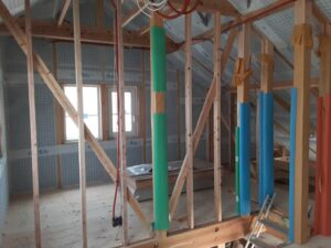 K様邸新築工事、セルロース断熱施工中、二階外壁部分天井施工完了。