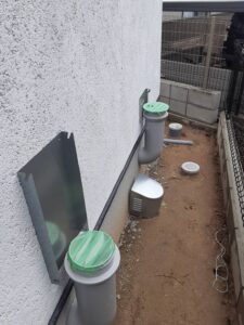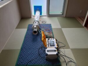 お引き渡し前の気密測定です。 セルロースファイバーを充填した断熱工法の建物です。 気密測定は気密測定器という家の隙間を調べる専用の機械を使って行います。 玄関ドア、窓などの開口部を施錠し、換気口をすべて養生テープで目張りします。測定機を設置する窓部分もしっかり目張りし外気が入ってこないようにしていきます。![]()