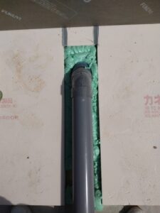 基礎コンクリートの配管貫通部にもホウ酸入りのパテ、シーリング材で隙間を塞ぎ、ホウ酸入り発泡ウレタンで断熱欠損部を充填します。