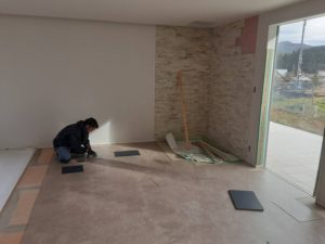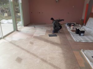 I様邸新築工事、今日から床工事です。 接着剤の乾きを見て塩ビタイルを貼っていきます。![]()