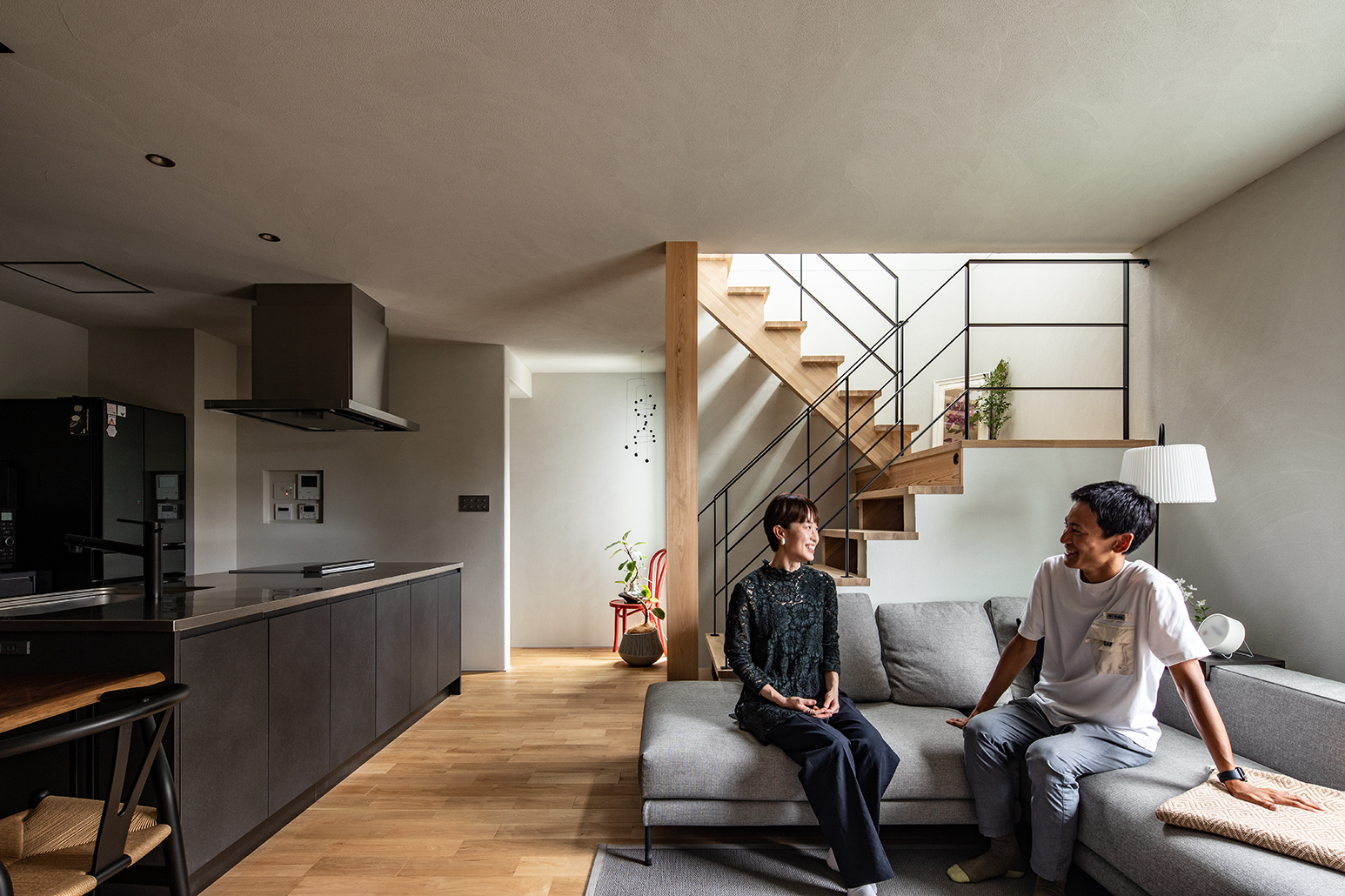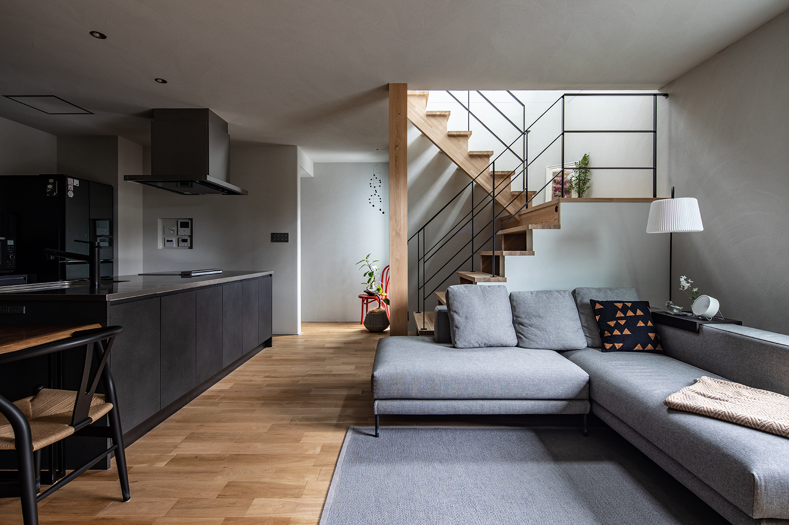 黒・グレーの落ち着いたトーンに、無垢床のぬくもりを重ねて、暮らしの景色を整えた一邸です。LDKはひと続きでも、階段と吹き抜け(抜け感のある手すり)によって視線が縦に伸び、面積以上の広がりを感じられる構成になっています。