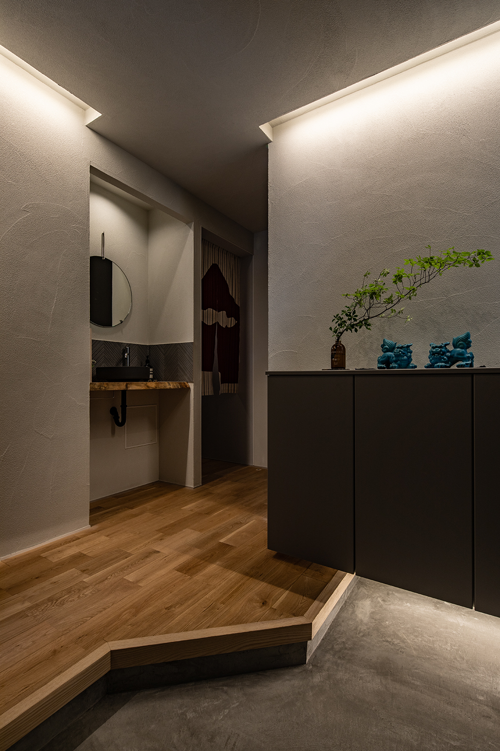 段差と素材の切り替えで“内と外”をやさしく分け、間接照明の陰影が迎えてくれます。必要な収納はしっかり隠し、いつでも気持ちよく整う設えに。