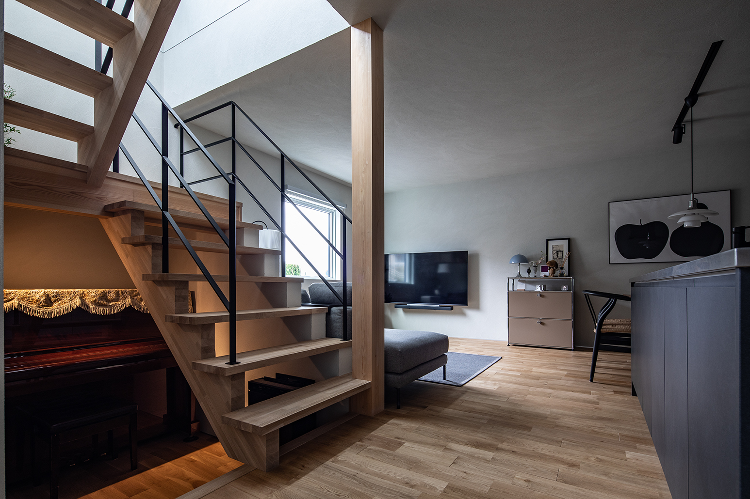 鉄骨手すり×踏板の軽やかな階段が、空間にリズムを生みます。