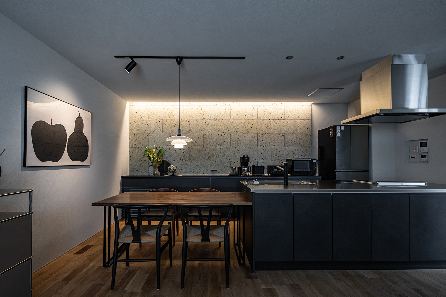 ダークトーンの面材でまとまりを出し、生活感を抑えながらも使いやすさはしっかり確保。LDK全体の景色を整え、家事の時間まで心地よく感じられるように仕上げました。