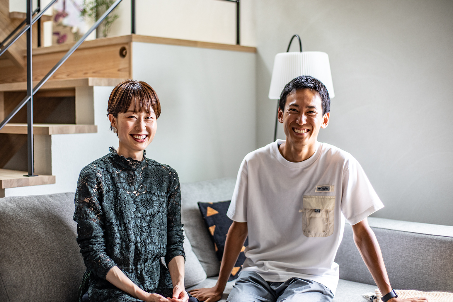 視線の先に階段と吹き抜けがのび、“広がり”と“こもり感”が同居するリビングです。余計な装飾は足さず、好きな家具やアートが自然に映える余白を残しました。