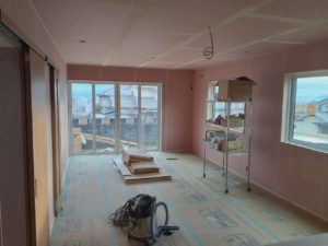 K様邸リノベーション内装工事中です。 まずは、石膏ボードのジョイントとビスが打ってあるところにパテ埋めをします。 内装が進むと一気に雰囲気が変わります。 完成が楽しみです!