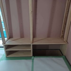 呉市K様邸造作TVボード制作中です。 床下エアコンを設置するスペースと併用のTVボードになります。 向かって右側のスペースがエアコン設置箇所です。 あとは格子を作成して、設置します。