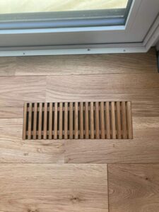 安芸郡K様邸床施工中です。 ガラリも取付けました! このガラリからは、床下エアコンの温かい空気が上がってきます。 同時に一種換気マーベックスVS90の給気口としての役割も兼ねています。