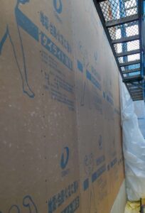 安佐南区I様邸外部面材貼り中です。ダイライトは釘のめり込みが大きいと耐力をとれなくなってしまいます。 そのため、最初は弱い力で釘打機で釘を打ち、上から金槌でたたいて面に合わせるようにします。