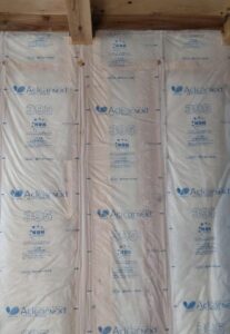 安佐南区I様邸断熱材工事中です! グラスウール施工において 手前に見える防湿フィルムは、柱の上に重ねて貼るのがポイントです!