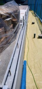 写真は、基礎と土台の間にくる気密用パッキンの土間リストを施工しているところです。