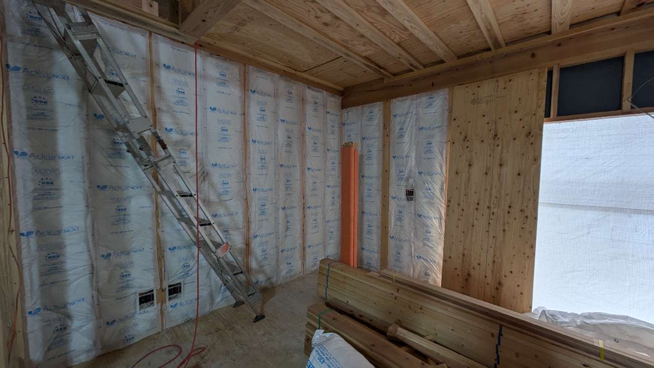 構造見学会に向けて、グラスウール断熱材の施工が進んでいます。