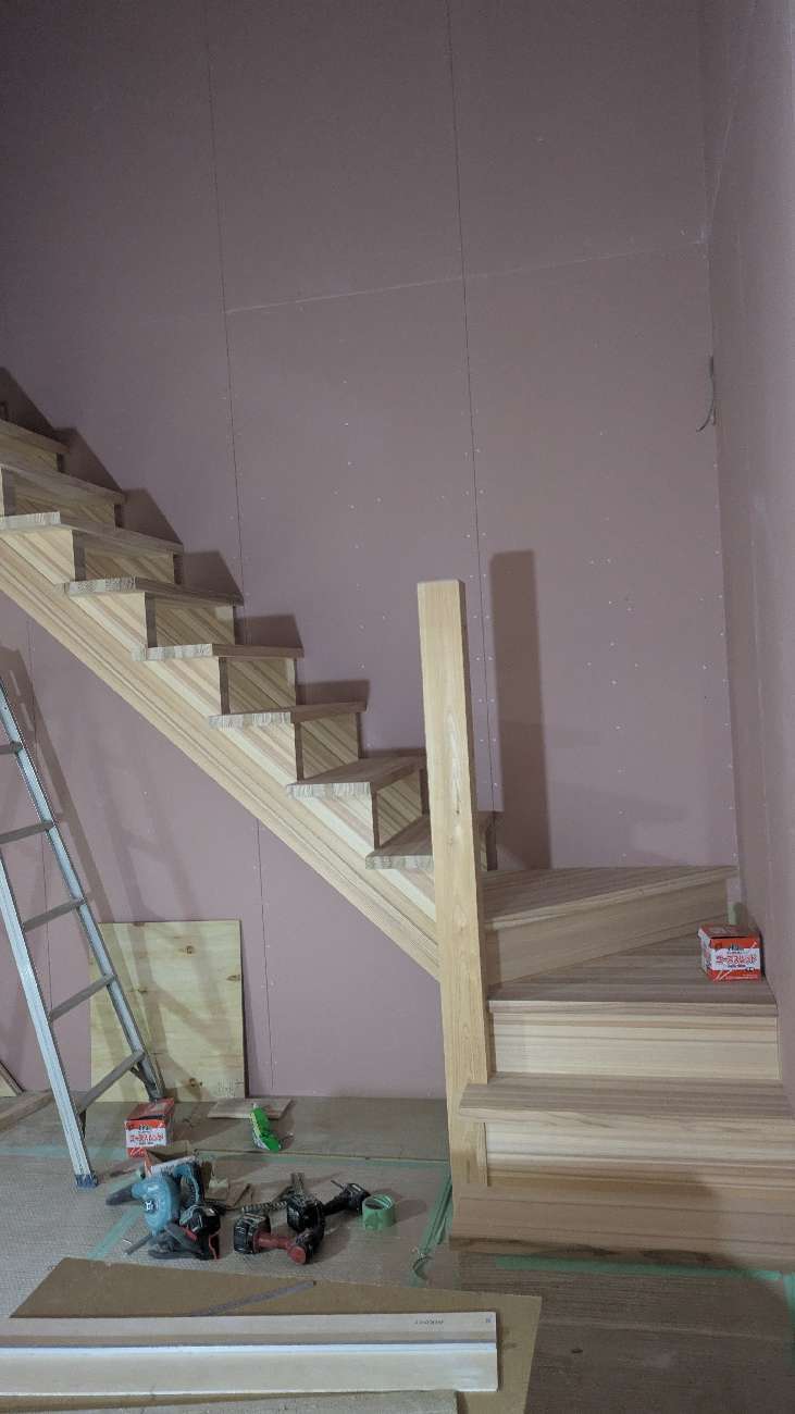 現在進行中の現場では、階段の造作が進んでいます。階段は、家の中で毎日使用される重要なパーツであり、機能性と美しさの両方を兼ね備えた仕上がりが求められる場所です。