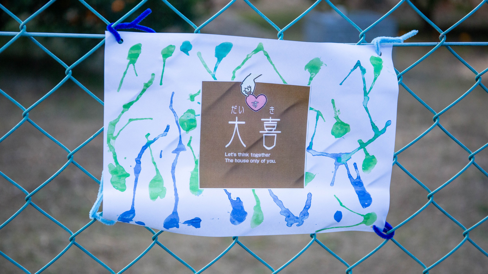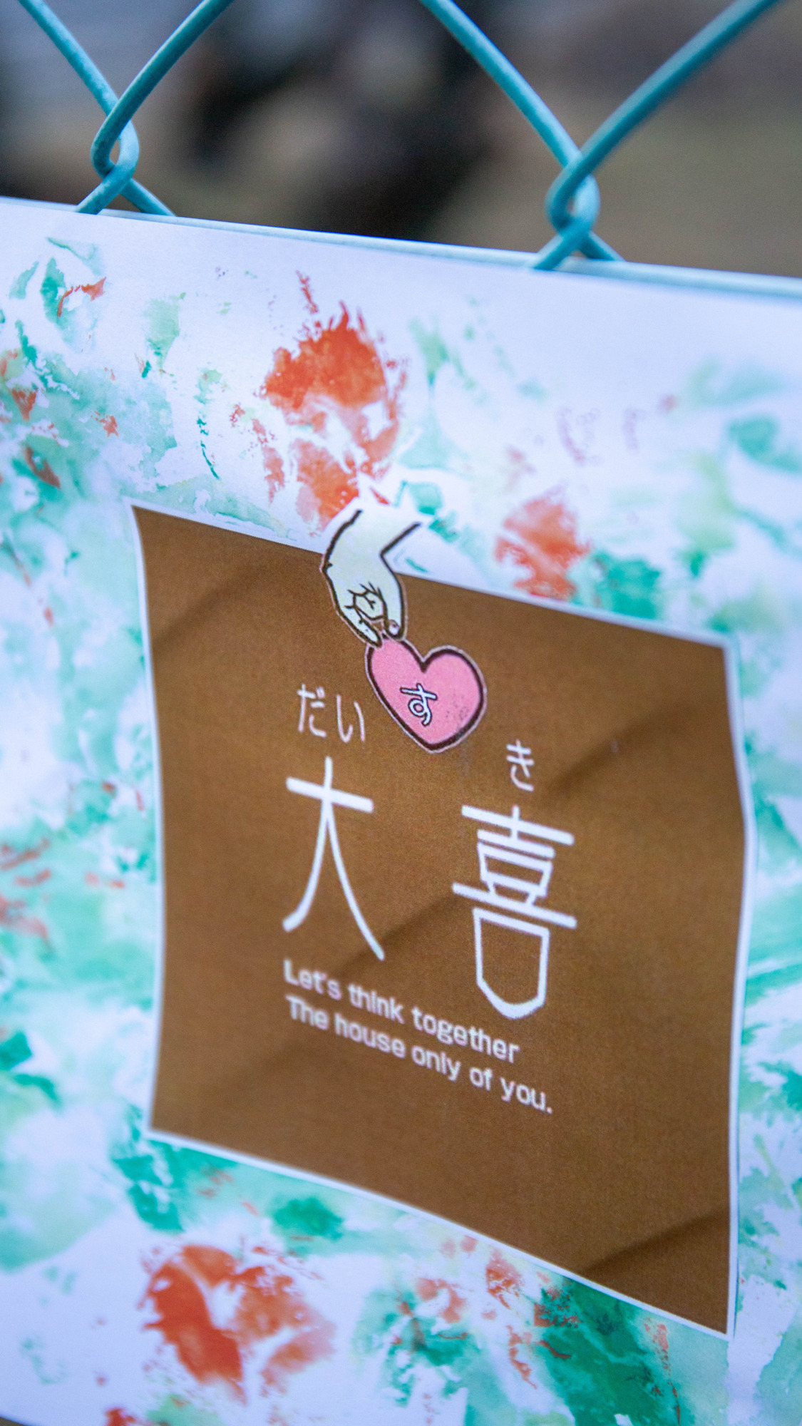 その旗には、弊社のロゴをモチーフにしたデザインが施されており、「大喜→だいき→だい“す”き」と、ロゴの中に「す」の文字をハートに加えた遊び心あふれる一枚でした。