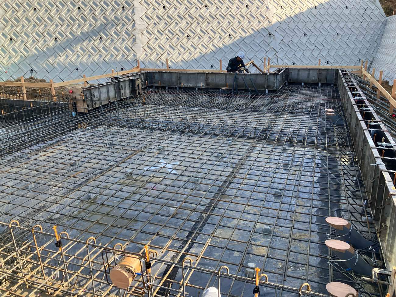 一般的なベタ基礎では、底部分にフラットな配筋が敷かれますが、