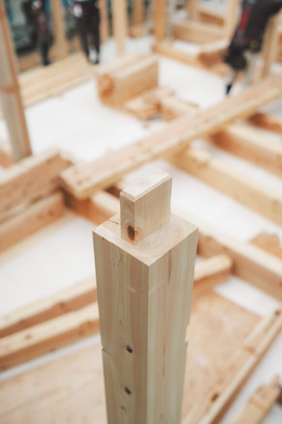 柱を一本一本、丁寧に建て込んでいく「建て方」作業。刻まれた材料が、図面通りに現場で組み上がっていく瞬間は、何度立ち会っても胸が熱くなります。
