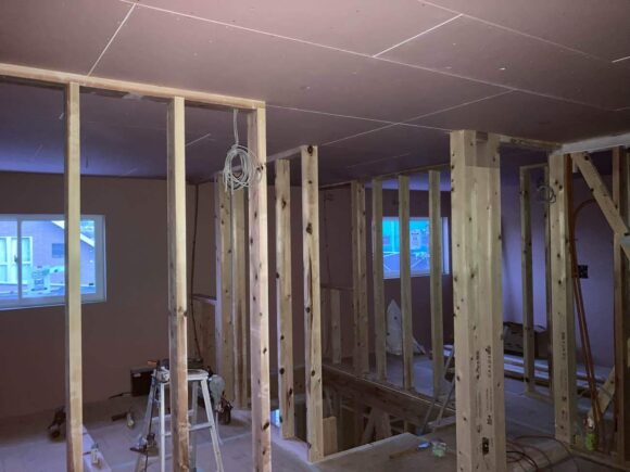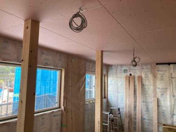 断熱施工の後は、ボード貼りの工程へと移ります。