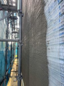 透湿防水シートの上にメッシュ(ラス)を張り、クラックを抑える下地を構成。ここが仕上がりの平滑さと耐久性を左右します。