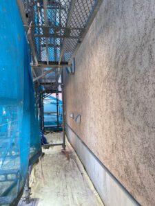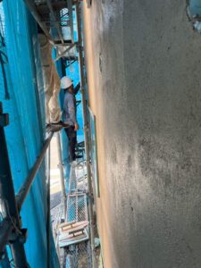 厚みを均一に塗り付け、コテ跡を丁寧に整えます。狭小足場でも一定の圧でならすのは熟練の技。