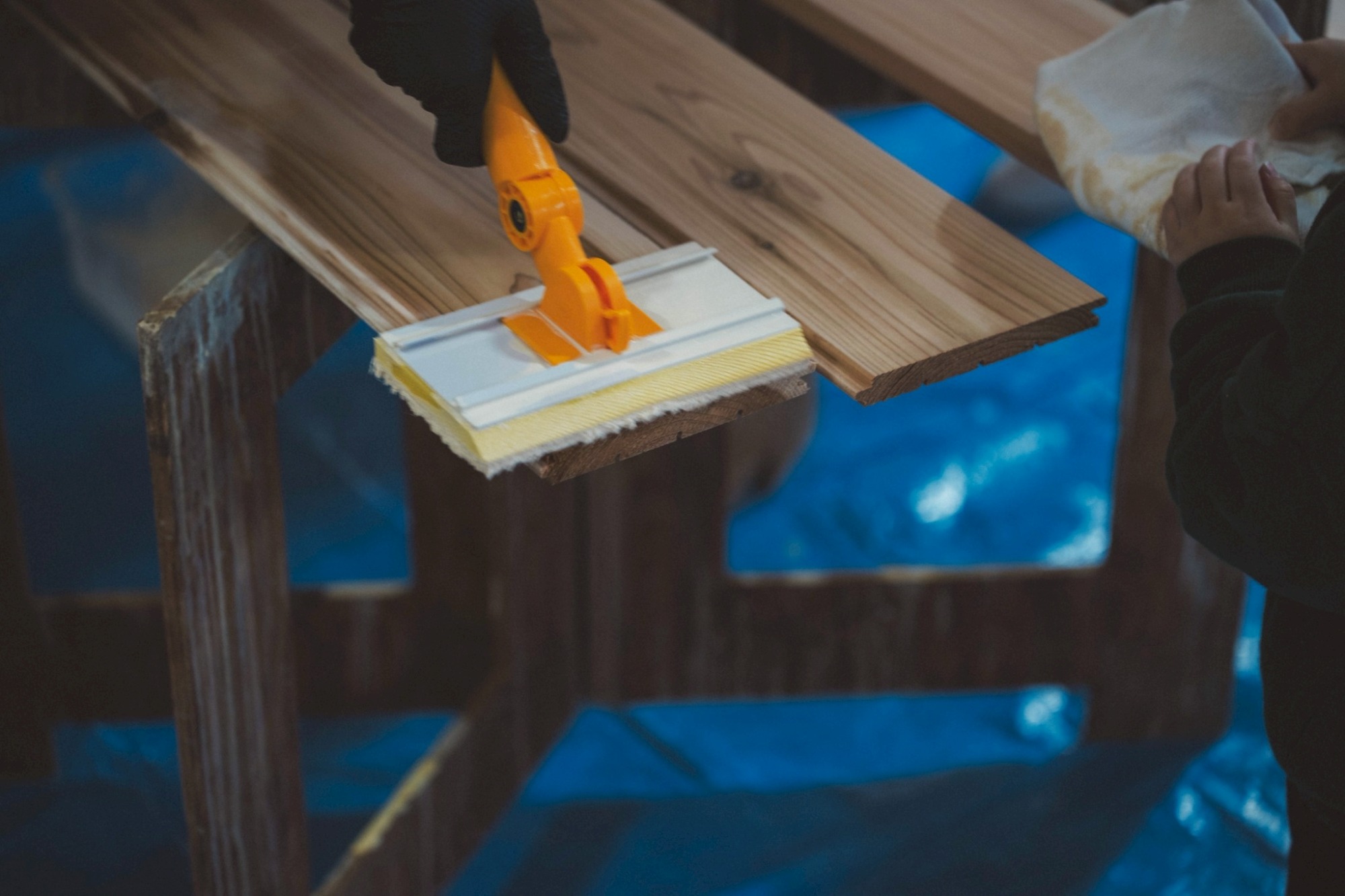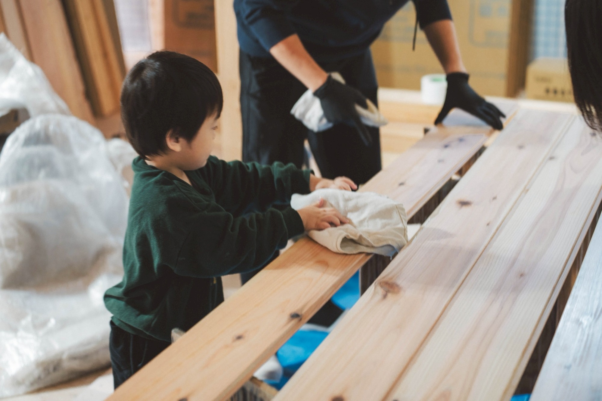 小さな手で、布を持ち、一枚一枚の床材にそっと塗料を伸ばしていきます。