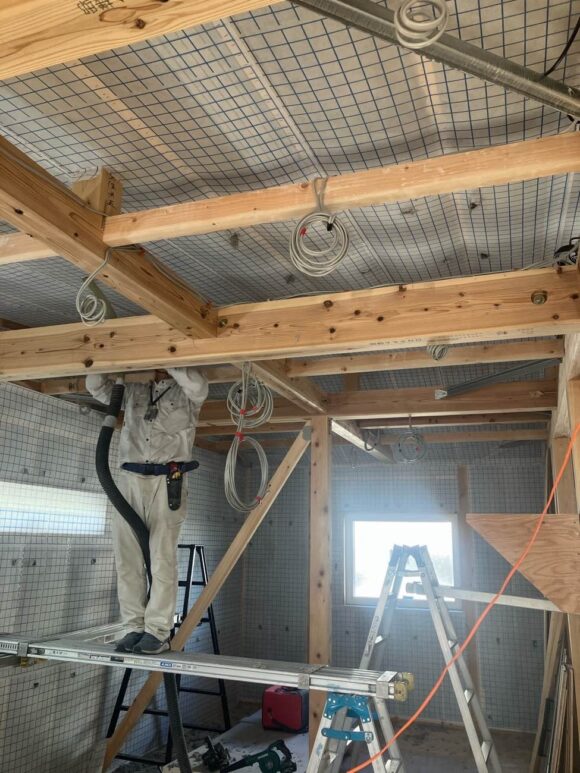 白いネット(格子状の下地)で壁や天井を丁寧に囲い、そこへ専用の機械でセルロースを吹き込んでいきます。 見た目はシンプルですが、“密度”と“充填ムラ”を出さない職人の手仕事が、性能を大きく左右します。