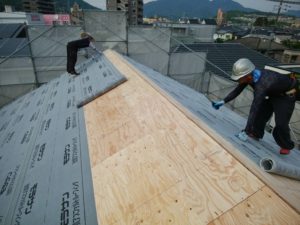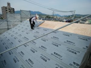 ホーム > ただいま施工中 >安佐南区T様邸新築工事(広島注文住宅)vol.133 ただいま施工中 EXECUTION 安佐南区T様邸新築工事(広島注文住宅)vol.133 投稿日:2019.05.14 一覧に戻る T様邸上棟いたしました。おめでとうございます。 私は午後から行かせていただきましたが、現場に到着した頃には2階までできていて早さには驚きました。 屋根が付いた後はアスファルトルーフィングという防水シートを貼ります。 大事な工程です。 下屋がなかったので1時間もかからず終わりました。 早く丁寧な仕事でした。 by1094