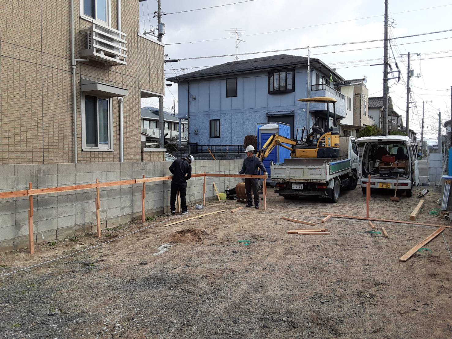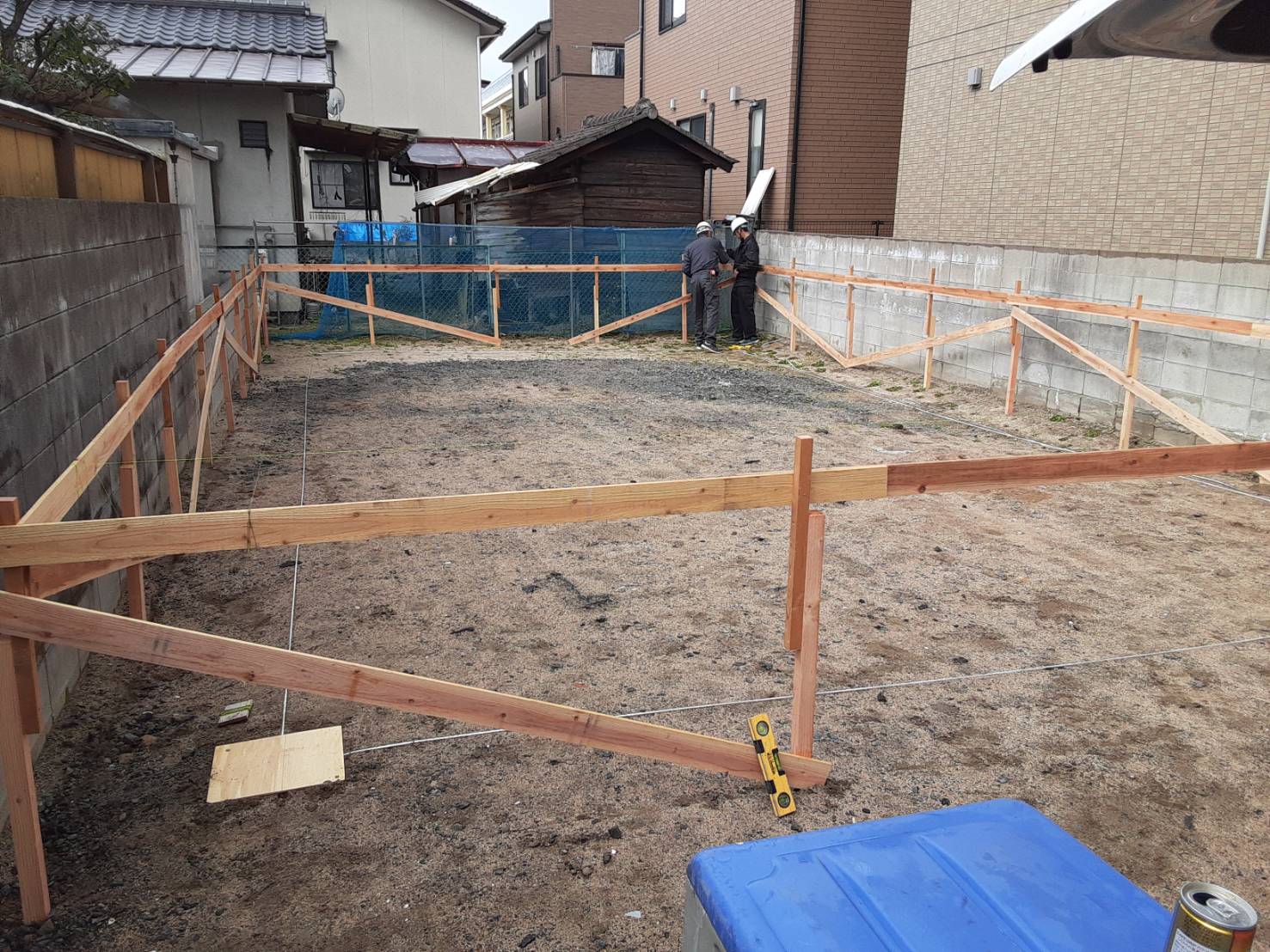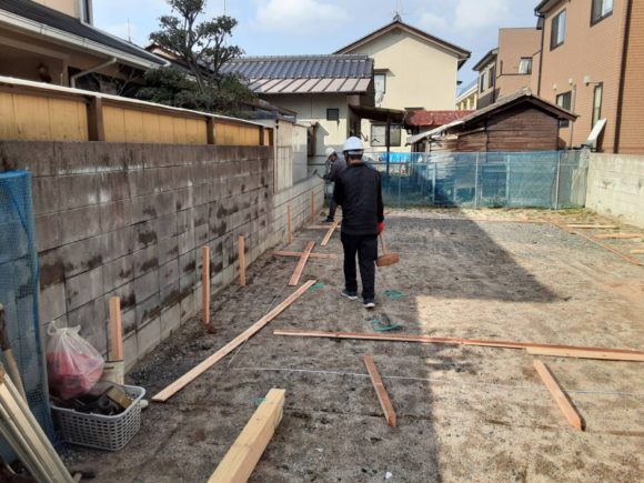 H様邸、やり方施工中です。木杭を打って、ラス板を水平に打付け建物の位置を出して行きます。