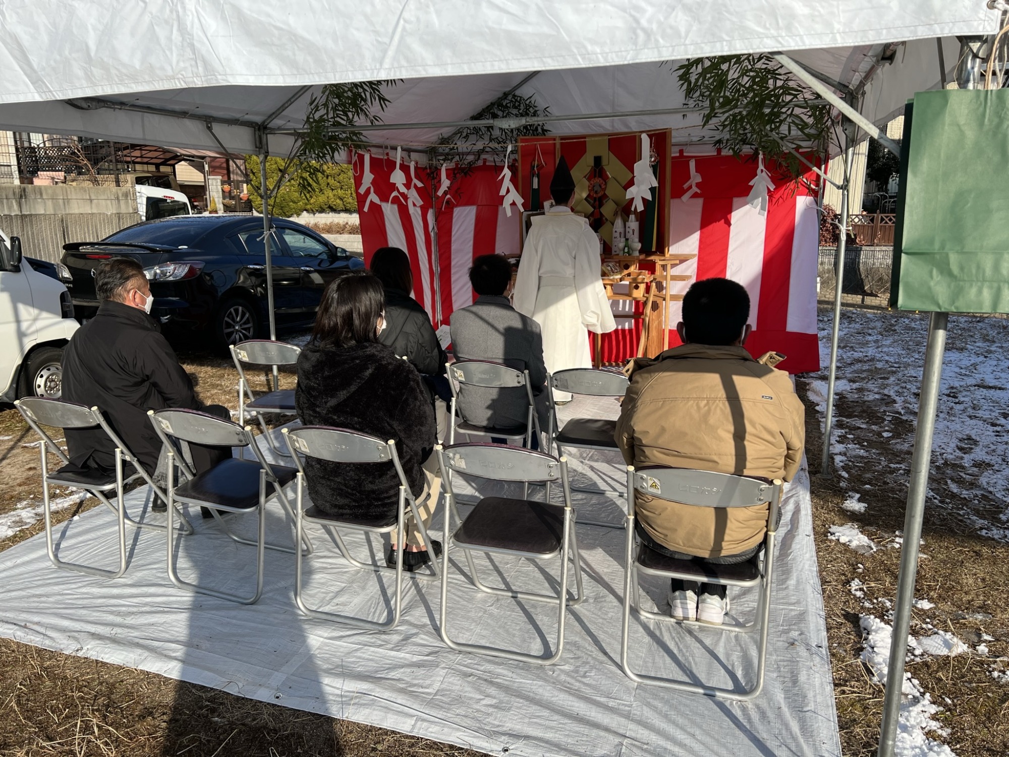 朝は雪が降っておりましたが地鎮祭が始まる頃にはすっかりやみ、天気の良い中での地鎮祭を執り行うことができました!