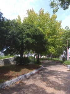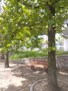 降りたところに広がる緑豊かな空間!たくさんの木々の下に長く続く石畳がすてきだなぁ✨て通るたびに思うんです!ベンチも置いてあって美しい場所です!