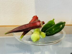 OBのお客様より家庭菜園で育てられたピーマン・赤と白オクラいただきました。