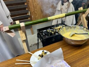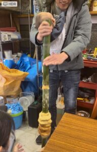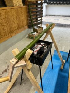 いつもお世話になっている篤創庭舎さんが山から切り出してくださった竹を芯に、工務担当野村君が作成してくれた台や回転道具を使い手作業で、何度も何度も塗り重ねては焼きを繰り返し出来上がりました。