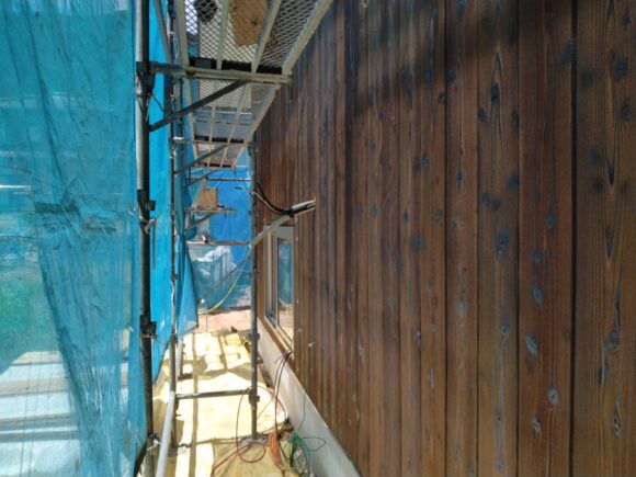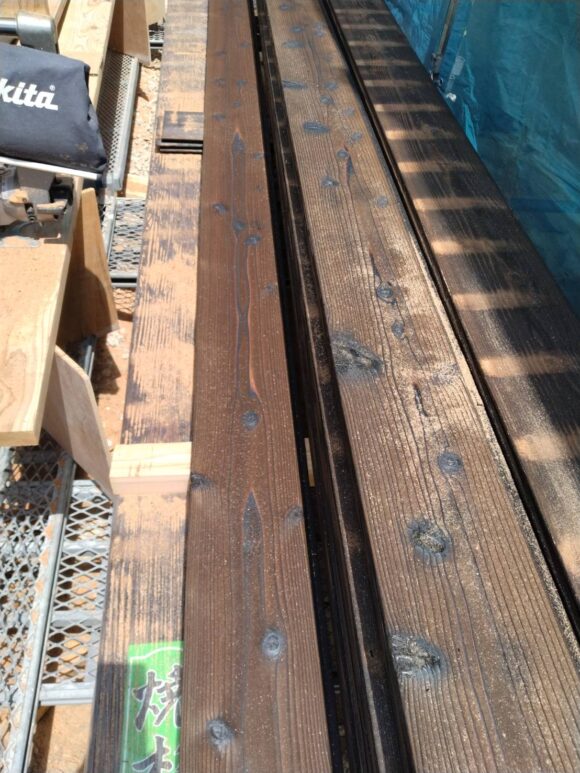 おはようございます。 吉岡です。 木造住宅の外壁仕上げの種類にはサイディング、モルタル、漆喰、板張り等が有ります。 サイディング張り仕上げが殆ど占めますが現在焼杉張り仕上げの物件を担当しております。 焼杉は古くから使われておりますが現在は稀です。 焼杉とは文字通り杉の表面を焼いたものでメリットとしては ・焼くことにより耐久性が高い ・木材なので熱伝導率が低いため断熱性能が高い ・風合いが良い等 逆にデメリットは ・焼いた表面は炭なので手などに付きやすい ・木材なので収縮が激しく割れや反りが発生しやすい ・色は選べない等 が有ります。 そのデメリットを解消するため焼いた表面に保護塗料を施す商品が有ります。 また部分張替えが可能なので割れや反りが発注した場合のメンテナンスも可能です。![]()
