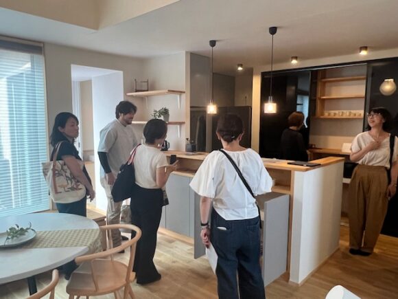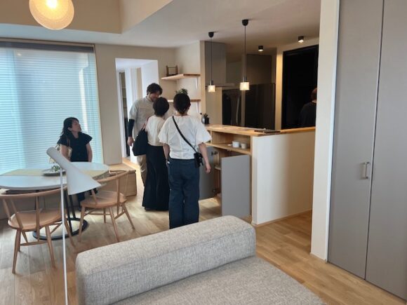 実際に室内をご覧になると、「これはいい!」「この仕上がりは感動ですね!」と、何度も写真を撮ったり、メモを取ったりされていて、 その姿を見て私たちも嬉しくなりました。 そして、次に訪れたのが「牛田東モデルハウス」。こちらは“小さな家で豊かに暮らす”がコンセプトのお家です。 コンパクトな間取りの中に、いかに心地よく暮らせるか、という点にとことんこだわってつくりました。 収納ももちろんポイント。限られたスペースでも、必要な場所にしっかりと収納を確保することで、暮らしやすさはぐんとアップします。